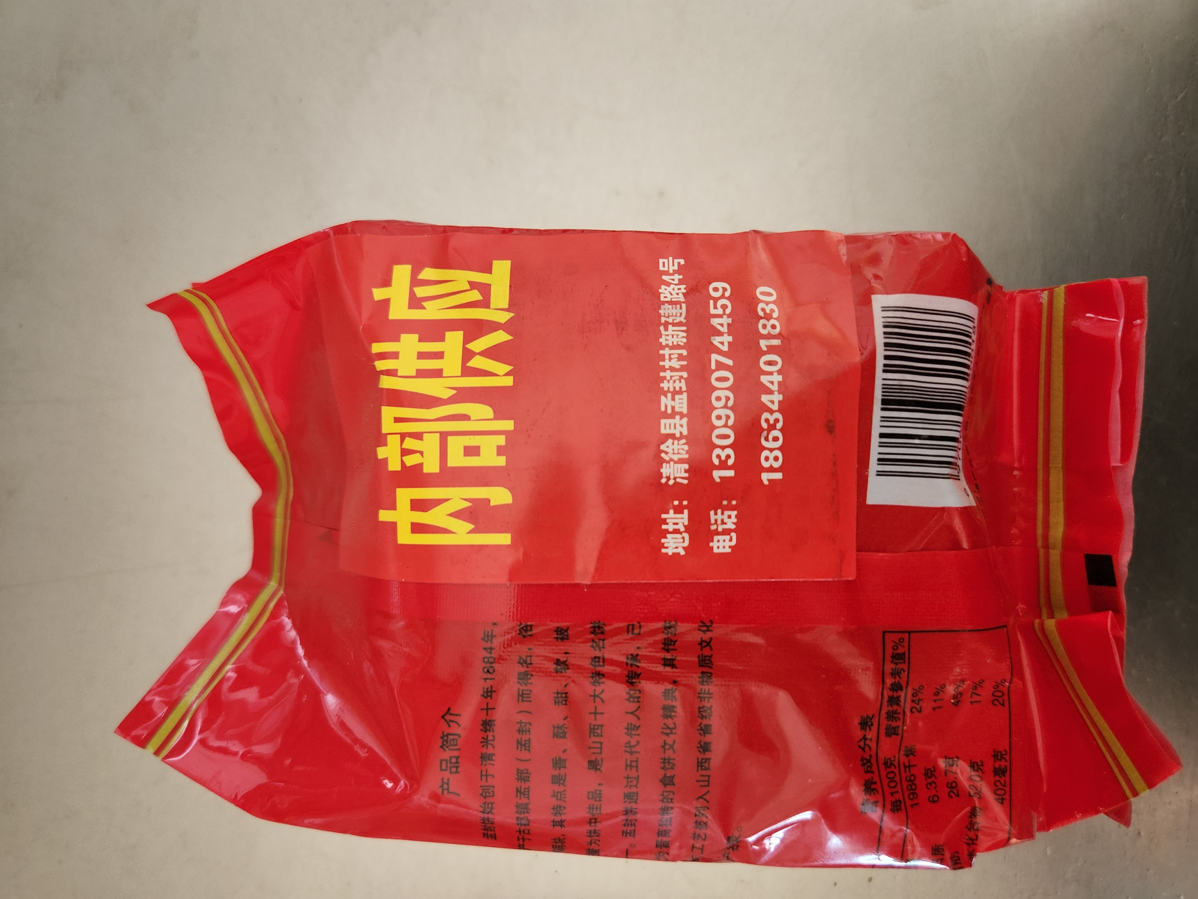 清徐孟封饼工艺独特,采用传统的吊炉、闷罐储倦烘焙;选料精优,调配合理,纯天然,不含防腐剂,符合现代食品要求;从开始配料到烤制成功,一般要经过二十四道工序。配料必须精准,每一道工序必须按流程严格进行,手工娴熟,不骄不躁,用心细致,许多要领天天操作才能熟练掌握。