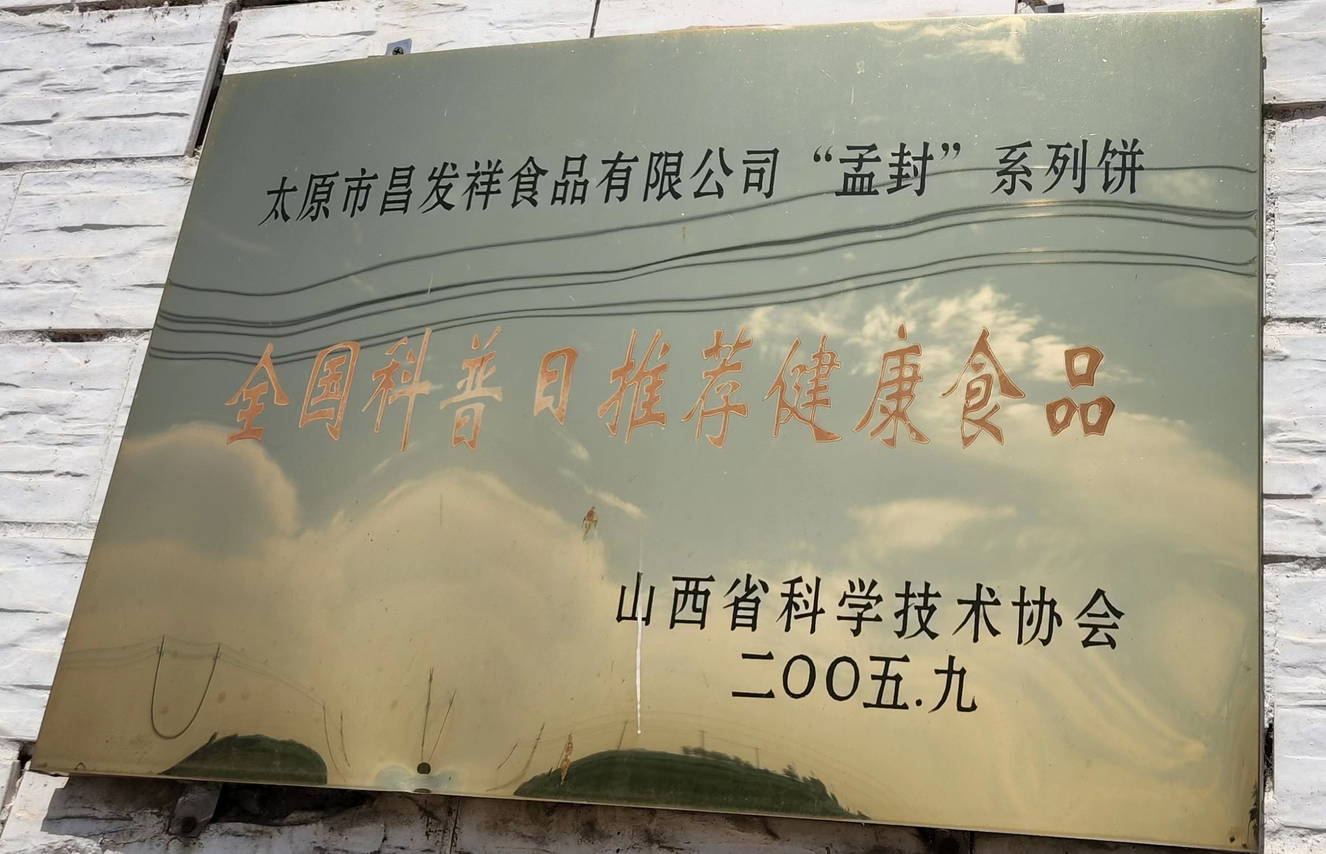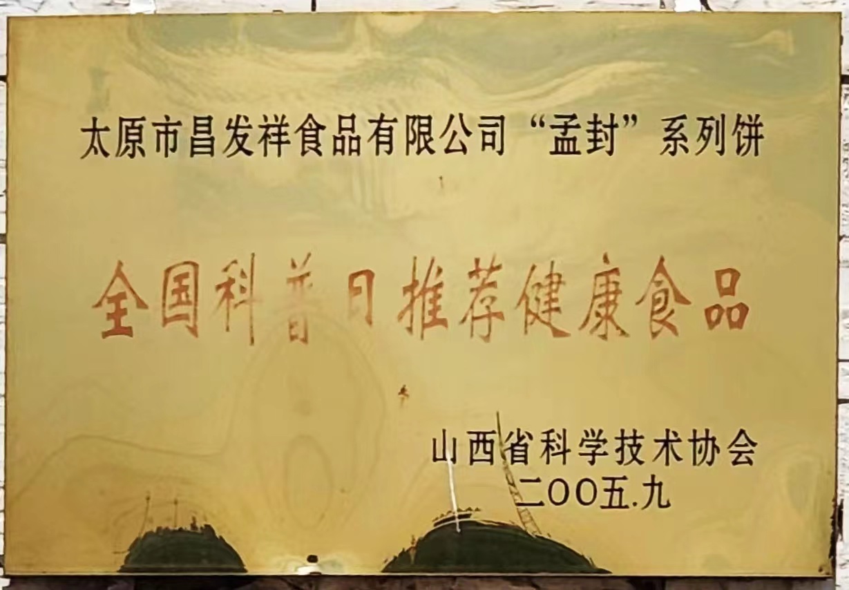 5.2005年9月,被山西省科学技术协会评为太原市昌发祥食品有限公司“孟封”系列饼全国科普日推荐健康食品